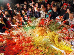 吉隆坡的华人用长长的筷子争相品尝当地特色食品——生鱼沙拉,以庆祝农历新年的到来。